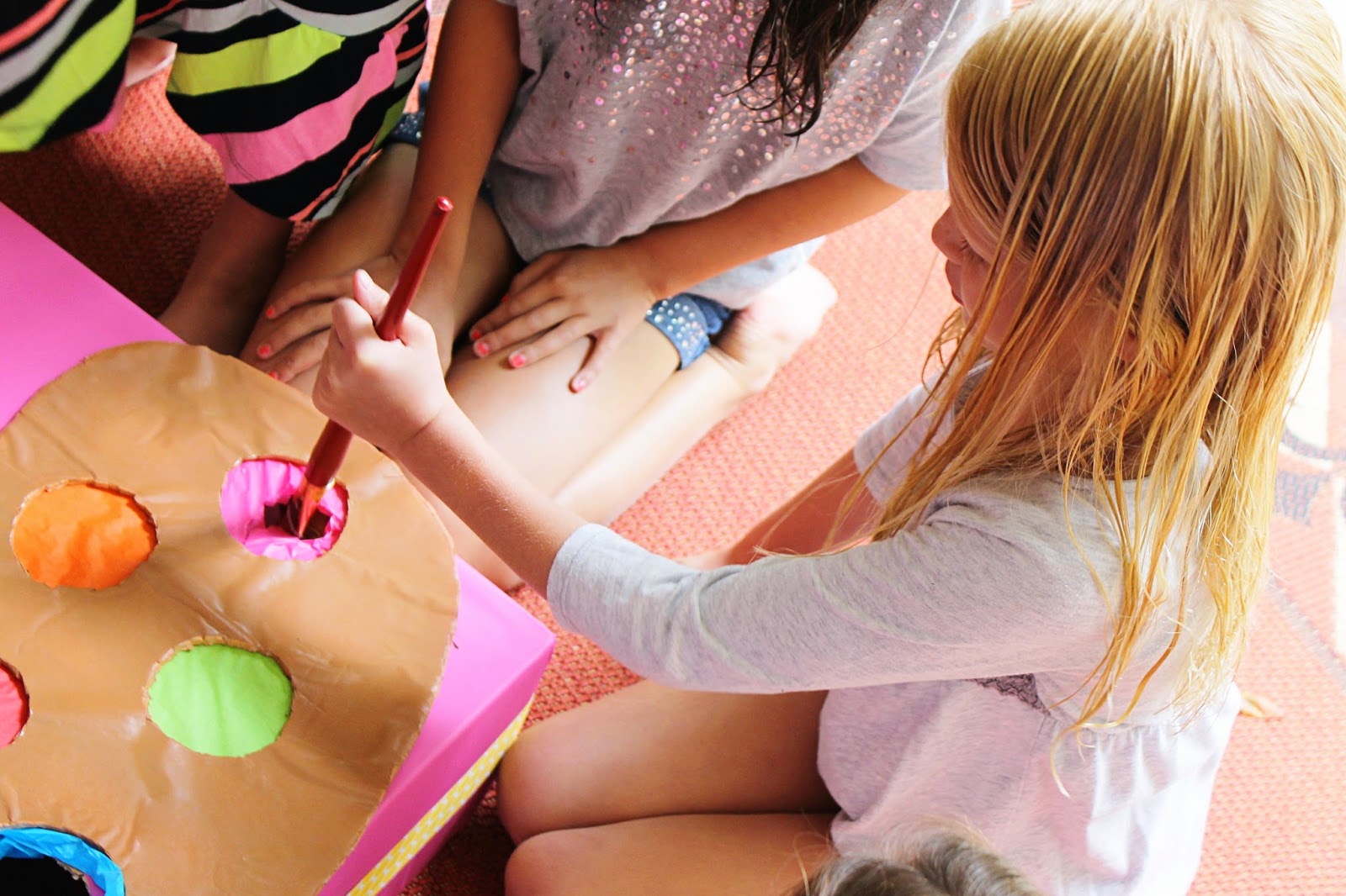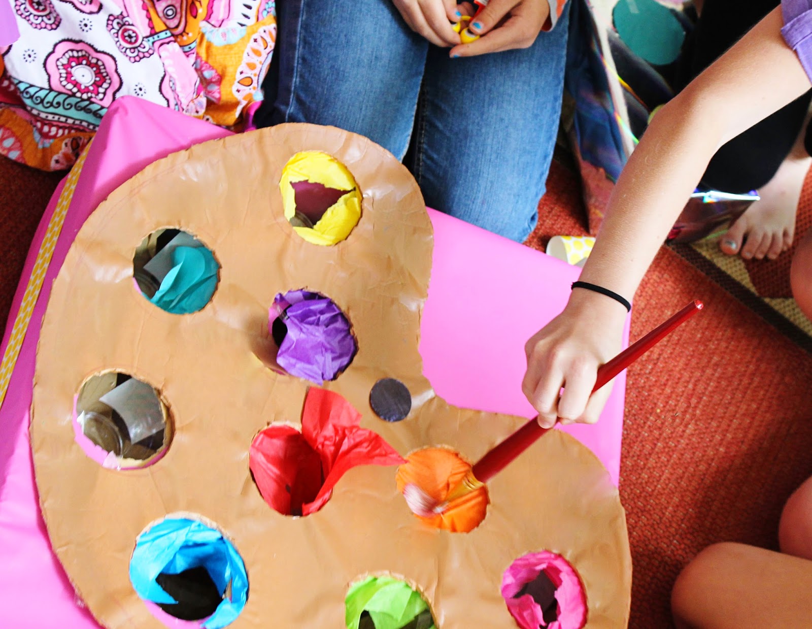 This was a fun little punch game I made. Under each color (tissue paper) was a prize. The girls used the paint brush to break the tissue paper and reveal their prize.